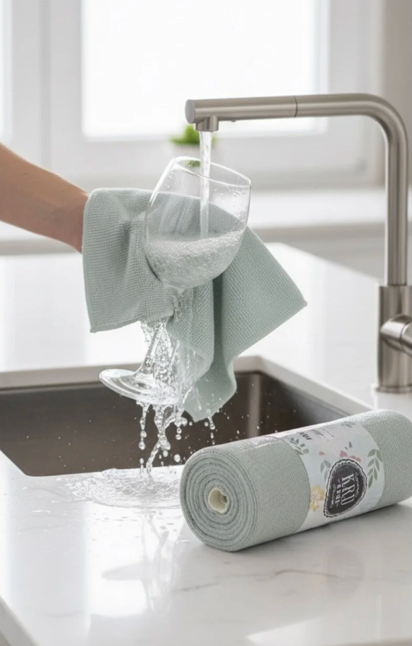Mikrofiber Rulo Havlu, yüzeylerdeki suyu ve kiri anında emer.